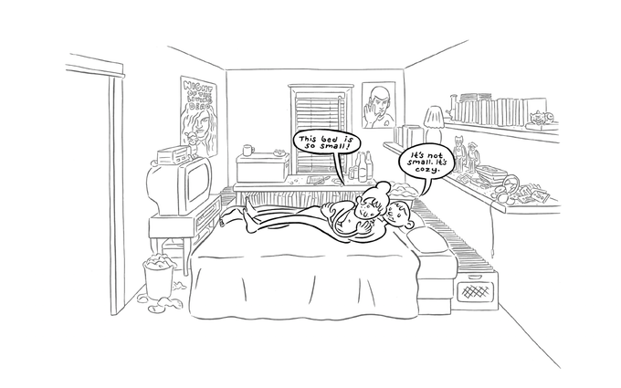 Twin Bed is a micro graphic novella about a relationship, as told through a series of scenes from a twin bed in a tiny New York apartment. The perspective never changes, and we watch the slow progression of this relationship over time.