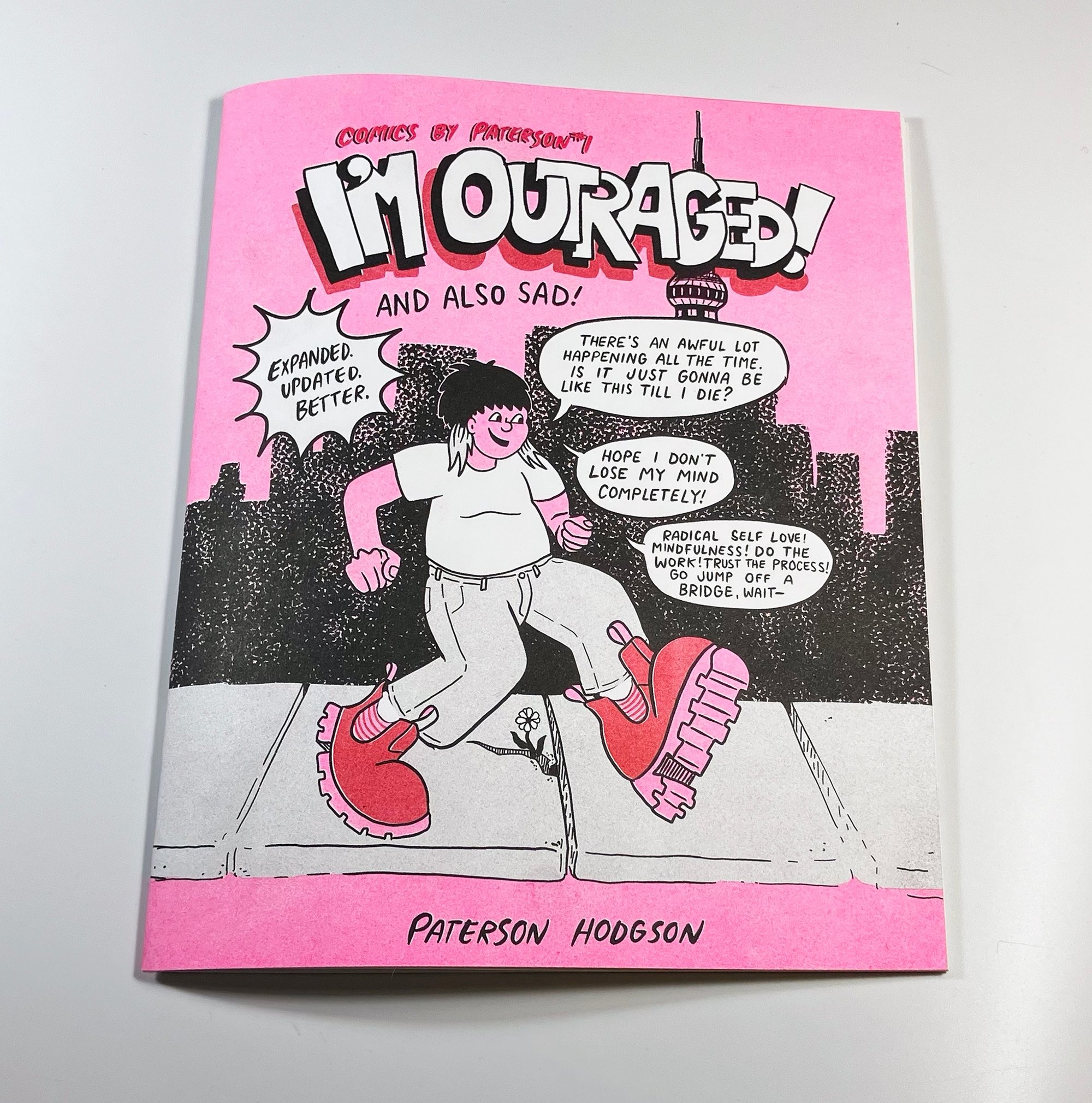 This playful mix of auto-bio and comics journalism follows Toronto-based cartoonist Paterson Hodgson as she becomes involved in COVID-era housing activism. "I'm Outraged! And Also Sad!" is a thoughtful and funny exploration of community and what it means to be a good neighbor. Previously published in 2022, this edition has new material and a Risograph cover.