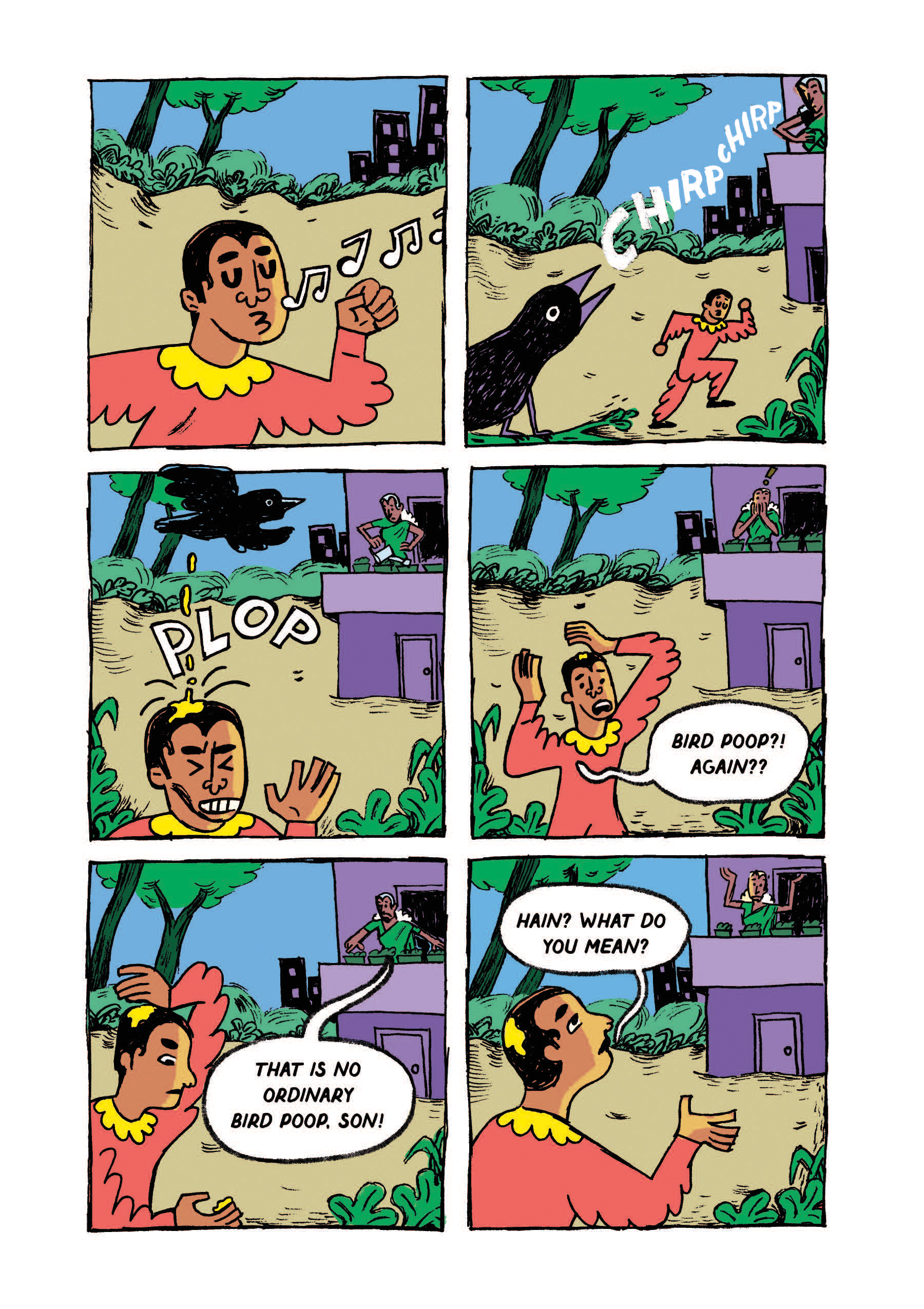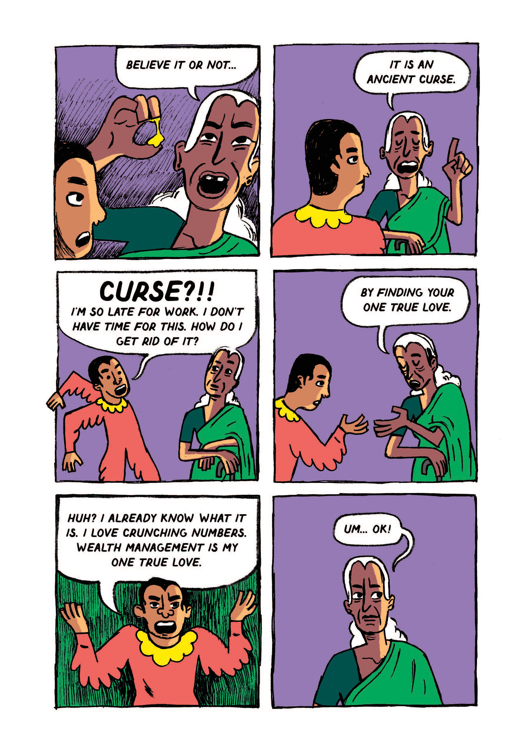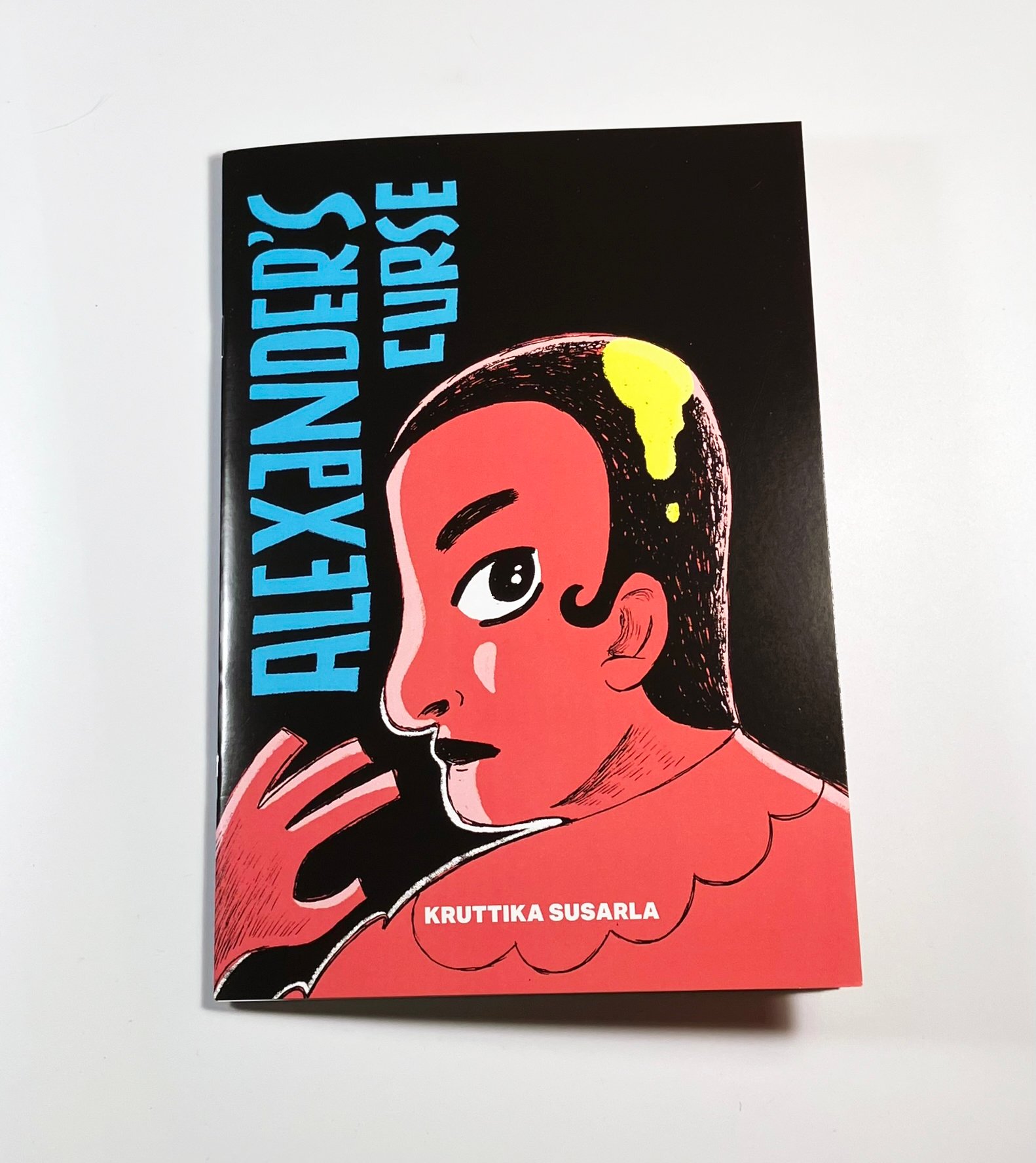 "Alexander's Curse" is an illustrated farce about an asset manager whose world is turned upside down when a bird poops on his head. This experimental and colorful comic was created by Kruttika Susarla, a US-based artist from Andhra Pradesh, India.