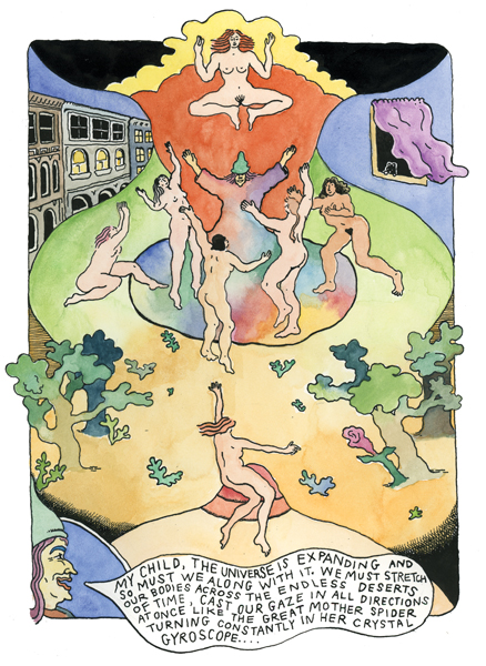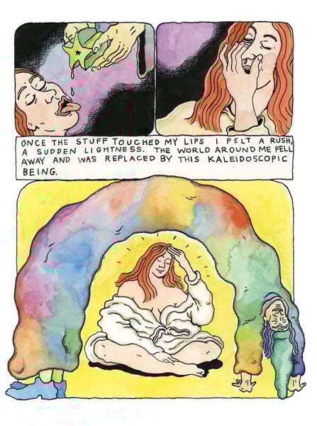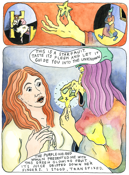 Star Fruit is Gretta Johnson’s debut comic book. A RISD graduate with a background in animation, Gretta is a promising new talent who has used watercolor, ink, and a dip pen to tell a surreal story in 32 technicolor pages. Star Fruit stars a nude woman and her cat, both on a strange journey in which they encounter a witch and a magical fruit.